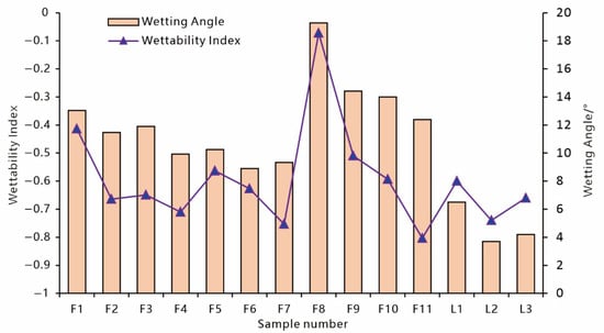 Cross-validation between the wetting index and contact angle measurements reveals a highly synergistic change pattern (Figure 10): a decrease in the wetting index is always accompanied by a synchronous reduction in the contact angle, which is also indicative of differences in oil-wettability. This data confirms the accuracy of the alternate imbibition experiments, where the observed oil phase imbibition volume is significantly higher than that of the water phase (wetting index = −0.57), matching the contact angle measurement results; simultaneously, this correlation further verifies the reliability of NMR continuous-measurement technology, as one feature of a significant increase in long relaxation components in oil-saturated samples is a direct reflection of oil-wettability at the pore scale. Ultimately, it is conclusively determined that the mixed-type shale of the Lucaogou Formation and Fengcheng Formation exhibits an overall oil-wet characteristic.