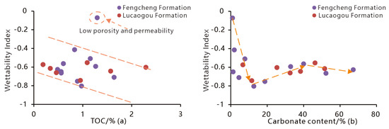 Organic matter in shale is key to producing oil-wet wettability, especially its non-polar components, which enhance the force of the interaction between rock and oil phases, making the rock surface more easily covered by oil [47]. In a saline lake basin turbidite-type shale setting, there is a linear relationship between the wettability index and TOC content (Figure 11a); the higher the TOC content, the lower the wettability index (the stronger the oil-wetness). This relationship was verified in two typical formations: the Lucaogou Formation is mainly composed of siltstone, while the Fengcheng Formation is mainly composed of felsic shale. Lithological comparisons show that samples from the Lucaogou Formation are mostly distributed in the high TOC range, with significantly higher TOC content than those from the Fengcheng Formation. Their average wettability index is lower, confirming that high organic matter abundance directly leads to stronger oil-wetness. The Fengcheng Formation has generally lower TOC content and weaker oil-wetness overall compared to the Lucaogou Formation. The Lucaogou Formation is mainly composed of calcareous siltstone and calcareous silt, while the Fengcheng Formation is mainly composed of calcareous mudstone, calcareous felsic mudstone, and siliceous mudstone, with relatively complex source material compositions. In terms of lithological comparison, samples from the Lucaogou Formation are mainly distributed in areas with a relatively higher TOC content, indicating increased organic matter abundance, and a generally lower wettability index, being more oil-wet. Samples from the Fengcheng Formation are mainly concentrated in areas with relatively lower TOC content, showing relatively weaker oil-wetness, reflecting that the overall oil-wetness of the Fengcheng Formation is not as strong as that of the Lucaogou Formation.