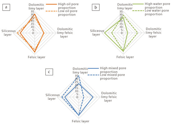 Relationship between wettability pore proportion and lamination proportion ((a) oil-wet pores; (b) water-wet pores; (c) mixed-wet pores).