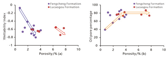 Porosity structure and wettability relationship ((a) porosity vs. wettability (b) porosity vs. oil pore percentage).