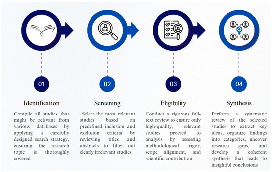 After defining the inclusion and exclusion criteria, the next step involved selecting studies that aligned with our research objectives. To ensure methodological rigor, we followed the PRISMA 2020 framework, and the completed PRISMA Checklist is provided in the Supplementary Materials. This process comprises four sequential phases: identification, screening, eligibility, and synthesis. By adhering closely to the PRISMA methodology, we ensured a transparent and systematic selection process. Figure 1 depicts the different steps applied for this literature review.