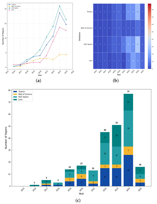 (a) Smoothed trend of papers published across databases. (b) Heatmap of papers published across databases. (c) Year-wise distribution of selected papers.