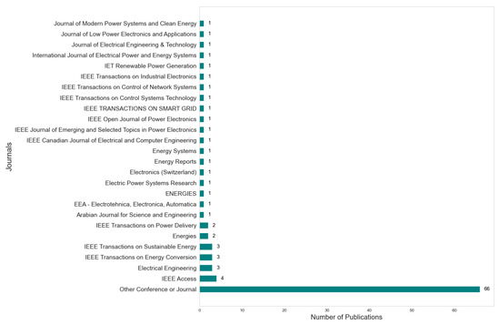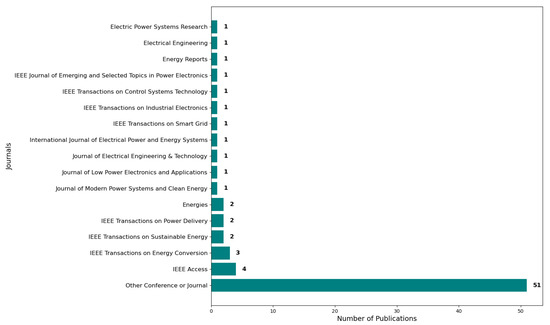 This section presents the structured synthesis of the studies selected through the systematic review process. The analysis emphasizes the evolution of research trends and the deployment of various GFM control strategies in modern power systems or microgrids. Figure 5 illustrates the distributions of studies included during the eligibility phase. As shown in Figure 6a, the final set comprised 42 studies from Scopus, 5 from Web of Science, 21 from IEEE, and 7 from LENS.