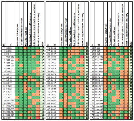 Figure 2 plays an essential role in visualizing the research landscape over the past decade. Figure 2a displays the year-by-year increase in academic output, while Figure 2b uses a heatmap to reveal the temporal density of publications by source. Finally, Figure 2c provides a comprehensive distribution of the selected studies. A clear rise in publication volume is evident: only 40 studies were published between 2015 and 2020, whereas 202 studies emerged between 2020 and 2025, reflecting a significant increase in research activity in recent years. This trend also highlights that grid-forming control is considered a hot topic in academia. The number of studies has generally increased over time. In 2021, the number of publications remained relatively constant compared to 2020, which could be attributed to the impact of the COVID-19 pandemic. However, from 2022 onward, the number of studies began to increase significantly as research activities resumed after the pandemic, reaching an increase of 77 studies in 2024. To maintain clarity and facilitate traceability throughout the review process, each study was assigned a distinct identifier linked to its originating database: Scopus-XXX (articles from Scopus), IEEE-XXX (articles from IEEE Xplore), WoS (articles from Web of Science), LENS-XXX (articles from Lens).