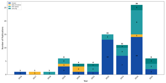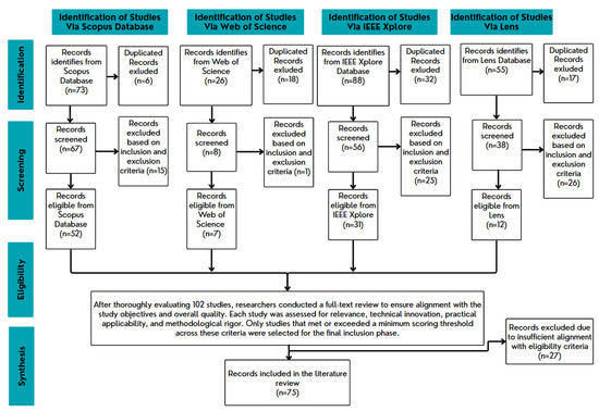 The main objective of this stage was to apply the inclusion and exclusion criteria detailed in Table 2 and to assess whether the abstracts met these criteria. Two researchers independently screened each study. Studies that met the criteria were marked as “yes”; those that did not were marked as “no”. This process ensured a rigorous and unbiased selection of relevant studies. Following the application of the search filters and criteria outlined in Section 2.1, the screening process illustrated in Figure 3 resulted in the exclusion of 63 records and the inclusion of 102 studies. Of these, 52 were sourced from Scopus, 7 from Web of Science, 31 from IEEE Xplore, and 12 from LENS, with 102 total studies.