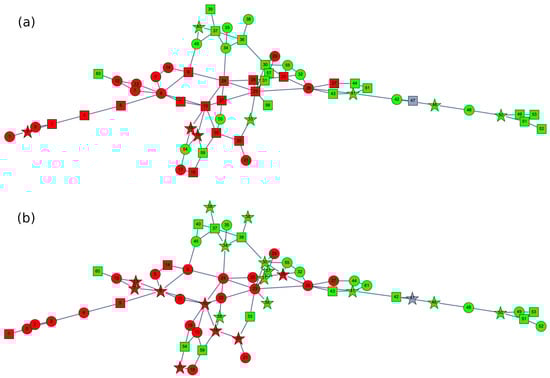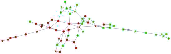 21]. The grid covers the four main islands of Minorca, Mallorca, Ibiza, and Formentera, interconnected by alternate current (AC) submarine cables, which for the purpose of the model are considered as regular overhead AC lines. The grid has a total of 62 nodes interconnected by 89 transmission lines. In addition, there is a connection to the mainland grid through an HVDC submarine cable. For simplicity, this cable is represented by an equivalent conventional plant located at the node where the cable is connected (the gray circle in
