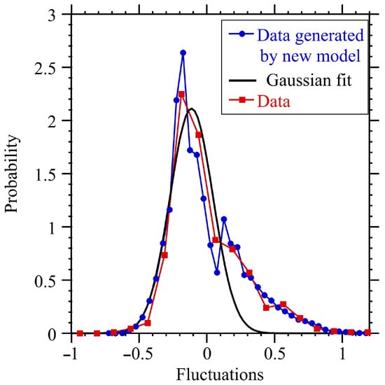 14] this distribution was fitted using a Gaussian fit (black line). Gaussian fitting works well for negative fluctuations, but underestimates positive fluctuations, as shown by the right tail in the figure; as a consequence, when performing simulations with the fitted Gaussian distribution for the daily fluctuations, the amount of days with large generation falls short. To address this issue, a new model for the daily fluctuations is considered here based on the combination of two Gaussian distributions. A distribution generated with this new model is plotted with blue symbols in the figure. The new model fits both the left and right tails of the distribution quite nicely.