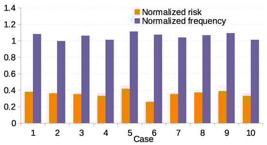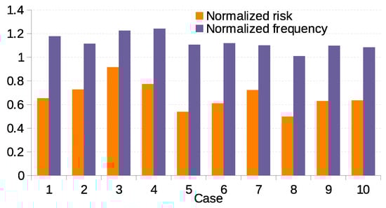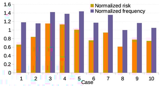 The risk is an indicator of the economic cost caused by blackouts. For each blackout, the cost is taken as proportional to the lost energy, which can be computed as the load shedding