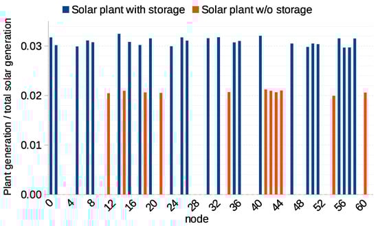Because storage is expensive, a more flexible scheme is considered here in which only a fraction of the solar plants have storage capacity. The optimal distribution of plants with storage is analyzed. Solar plants without storage provide daily generation capacity equivalent to the solar output on that day, while solar plants with storage provide daily capacity equal to the solar generation plus the energy stored in the battery. Dispatch allocates generation between conventional and solar plants, ensuring that total generation matches total demand and does not exceed the maximum capacity of any plant or line. Due to their lower generation cost, solar plants are prioritized in dispatch over conventional plants.