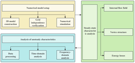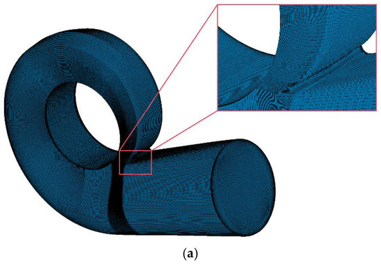 where , and ω and k are the turbulent vortex frequency and turbulence intensity, respectively. Integrating the local entropy production rate of the calculation domain can obtain the entropy production caused by the time-average velocity and the pulsating velocity [24,25], and the formula is as follows: