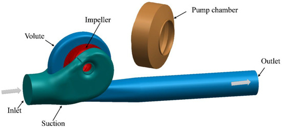 Numerical simulations were conducted using ANSYS CFX to analyze the full-flow field characteristics of the prototype pump. The fluid medium was defined as water at 25 °C, with turbulence modeling employing the SST k-ω formulation. Boundary conditions comprised a total pressure inlet (reference pressure: 1 atm) and mass flow outlet. The computational domain was partitioned into rotating (impeller) and stationary (pump chamber, volute, suction chamber) regions, interconnected via interface boundaries. For steady-state simulations, the Frozen Rotor method governed data transfer at rotor–stator interfaces, with solution convergence achieved when RMS residuals reached below 10−6.