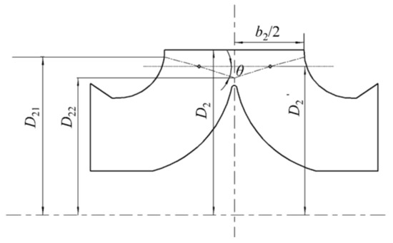 Forward oblique cutting of double-suction impeller outlets involves symmetrical material removal from the front shroud to the back shroud under constant post-trimming mean diameter D2’, creating distinct angular configurations (θ), as shown in Figure 3. The geometric parameters are defined as follows: trimming angle θ, original diameter D2, trimmed mean diameter D2’, shroud/hub diameters D21 and D22, trimming allowance ΔD, and trimming ratio φD. The governing relationships are as follows:
