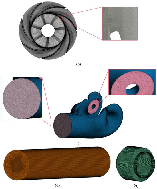 Schematic diagram of the grid of each component. (a) Mesh of volute. (b) Mesh of impeller. (c) Mesh of suction chamber. (d) Mesh of outlet pipe. (e) Mesh of pump chamber.
