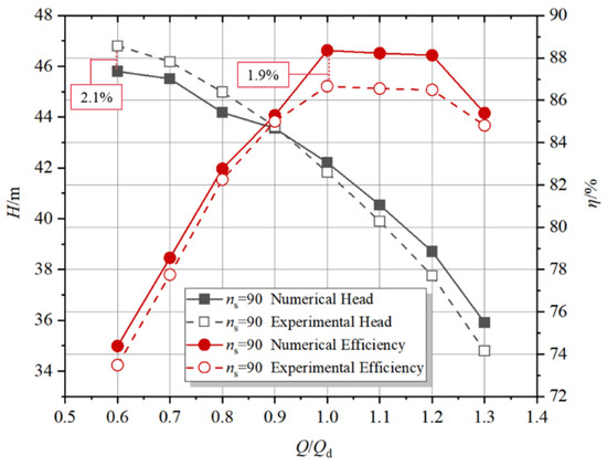 Figure 6 presents comparative performance curves between numerical simulations and experimental measurements for the prototype pump. Steady-state simulations employed time-averaged results from the final 120 iterations, demonstrating close agreement with test data: maximum relative errors of 1.9% in efficiency and 2.1% in head—both within acceptable 3% thresholds—confirm the computational model’s reliability in capturing internal flow dynamics. Observed discrepancies originate primarily from turbulence model limitations and experimental measurement uncertainties.