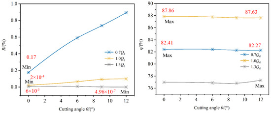 Comparison of reflux ratio at the impeller outlet and efficiency with different oblique cutting angles under various working conditions.