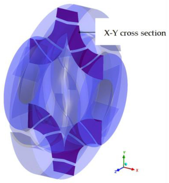 To investigate the influence of different oblique cutting angles on the flow field within the impeller, the X-Y cross-section of the impeller, specifically the meridional plane, was constructed as shown in Figure 8. The coordinate origin is located at the geometric center of the impeller, with the inflow direction aligned with the X-axis.