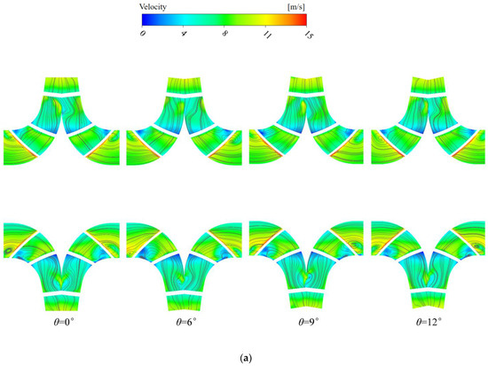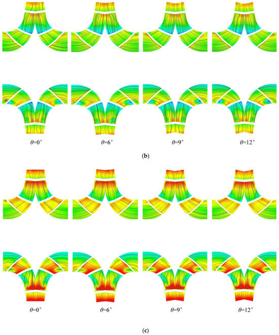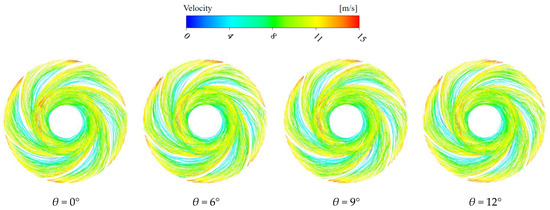 Under design conditions, three characteristic vortex types were consistently observed across four oblique cutting angle configurations: Leading Edge Vortices (LEV) from blade-leading-edge flow separation, Wake Vortices (WV) induced by trailing-edge jet–wake interactions, and Tip Leakage Vortices (TLV) originating from blade–tip boundary layer separation. Progressive increases in oblique cutting angles modified the blade exit angle, redirecting fluid flow paths. This redirection amplified suction-side low-pressure zones near trailing edges, driving sequential expansion of WV, LEV, and TLV regions. The spatial growth of these vortices correlated with elevated energy dissipation via intensified turbulent interactions. Three-dimensional streamline visualizations depict vortex structure distributions within the impeller, as presented in Figure 11. Progressive extension of low-velocity zones toward the blade leading edge regions is observed with increasing oblique cutting angles, while simultaneously intensified flow disorder emerges near the suction surface trailing edge. This progressive flow variation directly visualizes alterations in impeller–internal vortex dynamics.