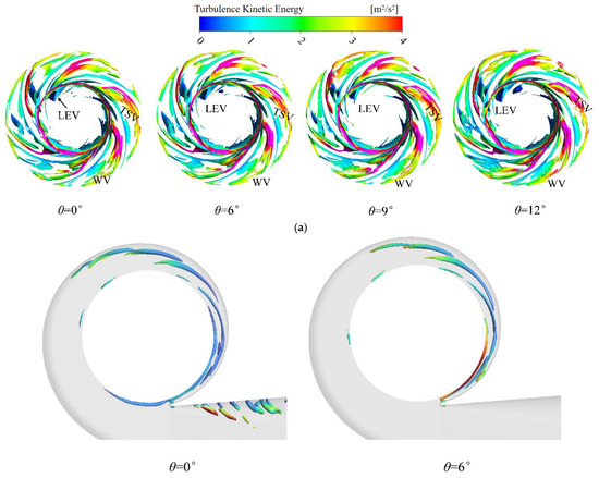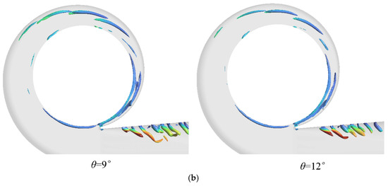 A systematic investigation into the impeller oblique cutting angle’s impact on vortex structures in double-suction pumps was conducted using the Ω vortex identification method. This approach enables precise discrimination of rotational motions and concurrent detection of vortices across intensity scales. By implementing a 0.52 threshold [19,20,21], vortices with distinct strength levels were differentiated within the impeller. Spatial-temporal evolution patterns of vortex structures were visualized through turbulent kinetic energy-based color mapping (as shown in Figure 10).