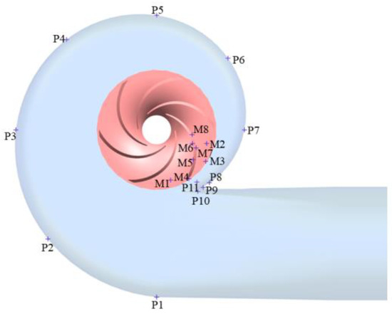 To investigate the transient pressure field characteristics induced by impeller oblique cutting in double-suction pumps, systematically positioned pressure pulsation monitoring points were implemented within the flow domain, as illustrated in Figure 12. Eight monitoring points (P1–P8) were uniformly distributed along the volute casing at 45° intervals, while three monitoring points (P9–P11) were concentrated near the volute tongue to capture flow separation characteristics. Additional monitoring points were positioned within the impeller flow channels (M1–M2), pump cavities (M3–M4), blade pressure surfaces (M7–M8), and blade suction surfaces (M5–M6).