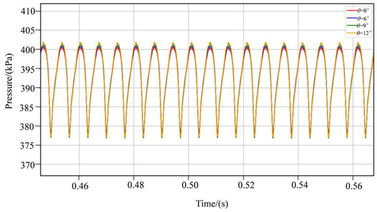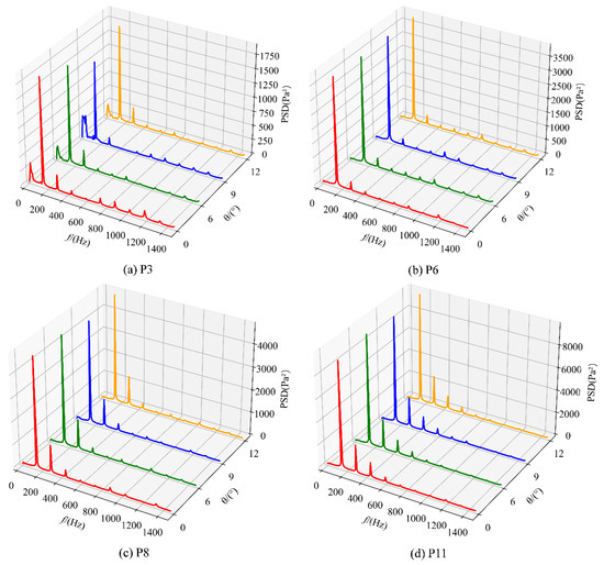 As shown in Figure 13, pressure variations at monitoring point P11 exhibited periodic behavior across three rotational cycles for all oblique cutting angle configurations, with 18 peaks and 18 troughs corresponding to the impeller’s six blades. This confirms the blade-induced periodic modulation of pressure fluctuations near the volute tongue. Pressure fluctuation amplitudes for the 9° and 12° bevel configurations exceeded those of the flat-cut and 6° oblique cutting. Collectively, these results demonstrate that flat-cut or smaller oblique cutting angles reduce static-rotor interaction intensity and subsequently suppress pulsation amplitudes at the volute tongue.