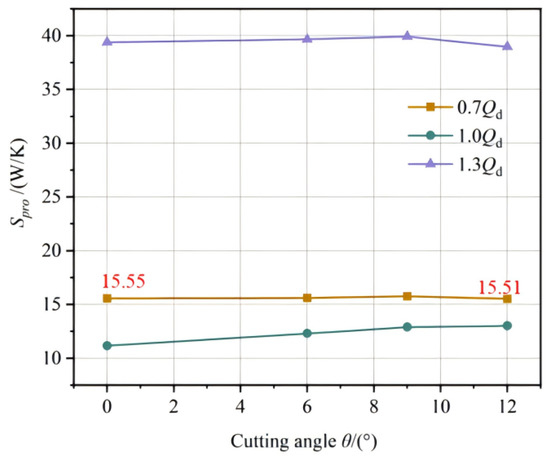 Figure 15 shows the influence law of the model pump at different oblique cutting angles under different working conditions on the total entropy production. It can be seen from the figure that with the increase in flow rate, the total entropy production of each oblique cutting scheme shows a trend of first decreasing and then increasing. Meanwhile, under both the low-flow condition and the design condition, the total entropy production increases slowly with the increase in the angle, but its increase rate shows a nonlinear relationship with the oblique cutting angles of the impeller. Under the working condition of high flow rate, with the increase in the cutting angle, the total entropy production in the pump shows a change characteristic of first slightly increasing and then significantly decreasing. Especially when the impeller is beveled by 12°, the total entropy production decreases significantly, indicating that under the working condition of high flow rate, adopting a larger impeller oblique cutting angles can effectively reduce the total entropy production of the double-suction pump. Therefore, in the optimal design of double-suction pumps, the reasonable selection of the impeller oblique cutting angles is one of the key parameters for the performance of the lift pump.