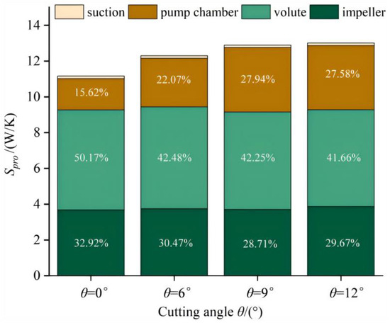 - This double-suction pump mainly relies on wall dissipation. An increase in the oblique cutting angles will intensify the wall effect, leading to an increase in energy loss and an increase in total entropy production. The volute is always the component with the maximum entropy generation, accounting for 41.66% to 50.71%. The bevel cutting of the impeller has the greatest impact on the pump cavity loss. Under the design conditions, the total entropy generation of the flat cutting scheme is the lowest. The bevel cutting will increase the non-uniformity of the impeller outlet velocity and intensify the turbulence loss in the pump cavity.