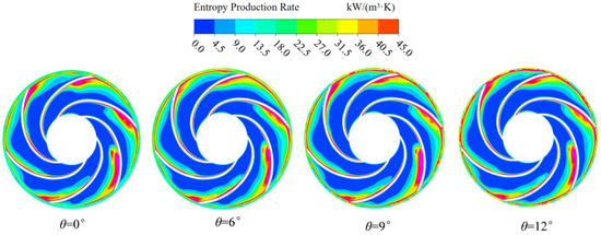 From the above analysis, it is clear that different angles of the impeller’s oblique cutting have the greatest impact on entropy loss in the pump cavity. In order to further analyze the energy loss in the transition zone between the impeller and the pump cavity caused by the impeller’s oblique cutting angle, a visual analysis of the losses at the impeller and the pump cavity is conducted. It can be seen from Figure 18 that the entropy generation is mainly concentrated on the suction surface of the blade and the junction area between the impeller outlet and the pump cavity. In the case of a flat cut of the impeller, the energy loss caused by reflux on the suction surface of the blade is relatively large. As the angle increases to 6°, the loss at the suction surface of the blade slightly decreases. As the angle increases, the range of the high-entropy production area in the pump cavity gradually expands, indicating that the entropy production loss in the pump cavity also increases accordingly. Simultaneously, combined with the vortex structure distribution above, it can be found that the high entropy generation region also corresponds to the high turbulent kinetic energy region. This spatial correspondence further substantiates that vortex formation inherently induces quantifiable entropy production.