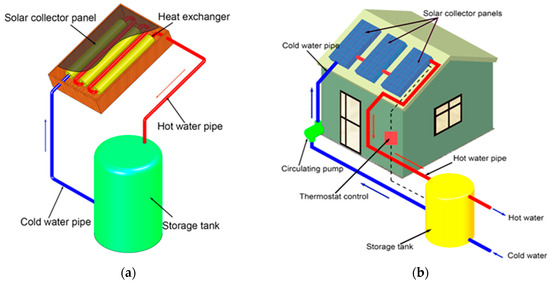 Solar water heating systems: (a) passive and (b) active.