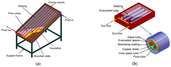 Flat plate collectors, commonly used for low-temperature heating, feature a flat, rectangular box structure featuring a transparent cover and an internal black absorber plate and are favored for their simple design, ease of installation, and cost-effectiveness [41]. Evacuated tube solar collectors are an effective technology for solar thermal energy, especially in regions with varied climates. Their ability to maintain high temperatures and efficiency in various conditions makes them a popular option for solar water heating and other thermal application [42,43,44]. The schematic representations of flat plate and evacuated tube collectors are shown in Figure 3.