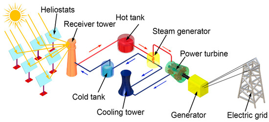 The heliostat field solar collector is a key advancement in solar thermal technology for concentrated solar power systems. Improving its design and efficiency is vital for enhancing performance and cost-effectiveness, as these fields, which use mirrors to reflect sunlight onto a central receiver, account for 40% to 50% of total investment costs and can incur significant energy losses if not optimized [51], as shown in Figure 5.