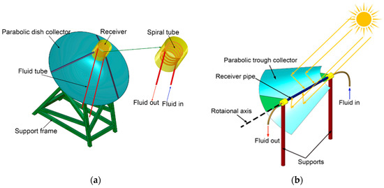 (a) Parabolic dish collector and (b) parabolic trough collector.