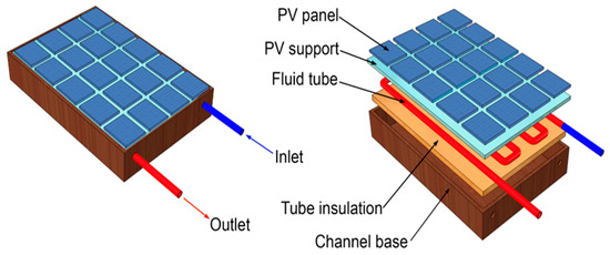 In rural healthcare contexts, the integration of hybrid photovoltaic–thermal systems has the potential to deliver significant advantages compared to stand-alone photovoltaic or thermal systems. Hybrid photovoltaic–thermal systems can achieve total efficiencies of up to 60–70%, compared to stand-alone photovoltaic systems (15–22%) or thermal systems (40–70%). By integrating both the electrical conversion efficiency of solar cells and the heating capabilities of the thermal component, they are particularly suitable for rural healthcare settings [58,59], which require both electricity for medical equipment and hot water for cleaning, sterilization, and patient care. However, when comparing costs, hybrid photovoltaic–thermal systems have a higher initial capital and maintenance expenses, whereas traditional stand-alone PV systems are more economically viable and have been more widely adopted in many low-resource environments [59,60]. Figure 7 illustrates this system, showing photovoltaic cells positioned on one side of an absorber plate and a fluid channel for heating on the opposite side. In the case of water, copper pipes are attached to the absorber plate, while for air, a channel is incorporated between the absorber plate and the rear plate, resembling the structure of solar air heaters.