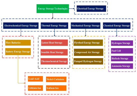 The classification of energy storage technologies, including TES, as shown in Figure 8 and Figure 9, categorizes them based on the type of energy they store and illustrates these diverse approaches [61,82,83] and comparisons of different battery technologies (Table 3).