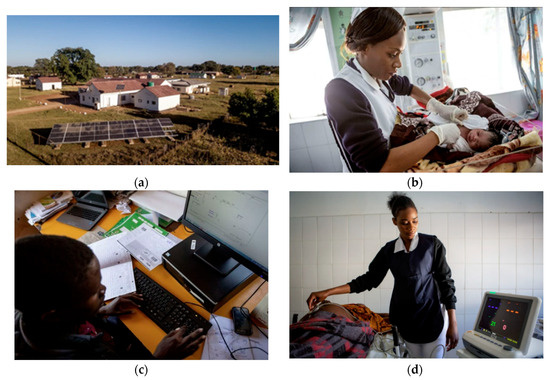 Solar panels installed at rural hospitals in Zimbabwe and Zambia [103]: (a) Solar panels powering the rural hospital in Bulawayo, Zimbabwe; (b) a healthcare professional delivers a baby at Chongwe District Hospital, Zambia; (c) keeping data secure without power interruptions at Sipape Rural Hospital in Bulawayo, Zimbabwe; and (d) a fetal heart rate monitor assisting a mother at Chongwe District Hospital, Lusaka Province, Zambia.