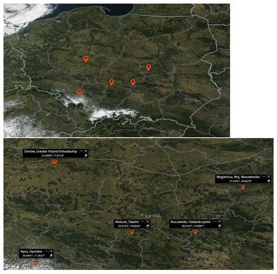 Approximate locations of photovoltaic farms in Poland whose data were used in the project.