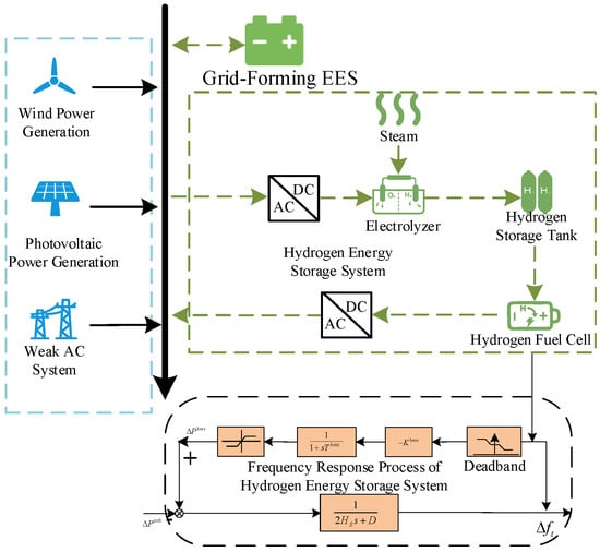 Hydrogen energy storage, known for its broad power regulation range and large-scale adaptability, is widely used in renewable energy bases. It effectively smooths wind and solar fluctuations and reduces curtailment [23,24]. Moreover, HES can emulate virtual synchronous generators to provide inertia support, enhancing the system’s frequency regulation capability. Reference [25] proposed a hydrogen-based solution to mitigate renewable energy intermittency and improve frequency stability. Power system analysis validated its effectiveness. Reference [26] developed a coordinated control strategy for hydrogen-powered microgrids using a disturbance-rejection model predictive controller (MPC), while [27] proposed a data-driven MPC for coordinating HESS and distributed generators in islanded microgrids, demonstrating effective real-time frequency regulation. However, these studies focused on frequency response under fixed power conditions without considering how capacity configuration affects the frequency support of EES and HESS.