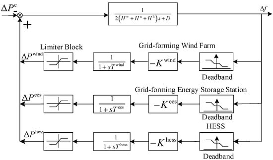 In Figure 2, represents the active power increment of the HESS; denotes the frequency deviation at time t; denotes the primary frequency regulation coefficient of the HESS; and indicates the system power imbalance.