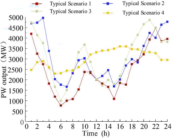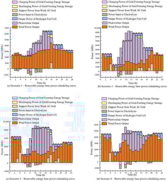 To validate the effectiveness of grid-forming EES and HES systems in maintaining power balance under a weak AC system environment, the operational curves under four typical scenarios are presented in Figure 8. As observed, the DC export power fluctuates with variations in wind and solar output. A constraint mechanism on DC operation duration is introduced to ensure power stability: within the defined time window, the DC export power is maintained at a constant level.