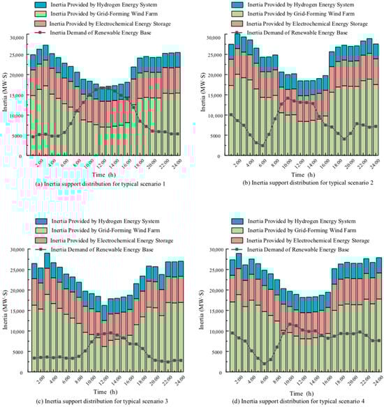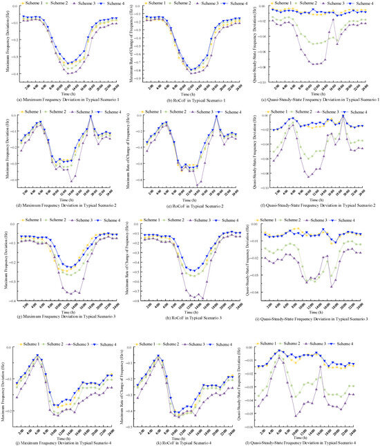 As shown in Figure 13, under Scheme 4, the detailed frequency indicators are as follows: In Scenario 1, the maximum frequency deviation and RoCoF occur at 12:00, with values of −0.3714 Hz and −0.8552 Hz/s, respectively, and the maximum quasi-steady-state frequency deviation appears at 16:00 with a value of −0.0142 Hz. In Scenario 2, the corresponding values at 12:00 are −0.2901 Hz and −0.6518 Hz/s, with the quasi-steady-state deviation at 08:00 being −0.0207 Hz. In Scenario 3, maximum deviation and RoCoF at 12:00 are −0.2118 Hz and −0.4881 Hz/s, while the quasi-steady-state deviation at 18:00 is −0.0109 Hz. In Scenario 4, the maximum deviation and RoCoF occur at 11:00 with values of −0.1823 Hz and −0.4098 Hz/s, and the quasi-steady-state deviation at 10:00 is −0.0145 Hz.