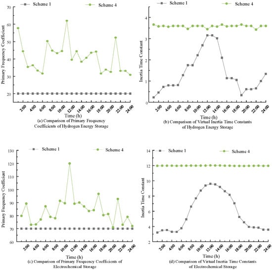 Taking Typical Scenario 1 as an example, the comparison between Scheme 1, which uses fixed primary frequency regulation coefficients and virtual inertia time constants, and Scheme 4, which employs optimized parameters, is illustrated in Figure 10.