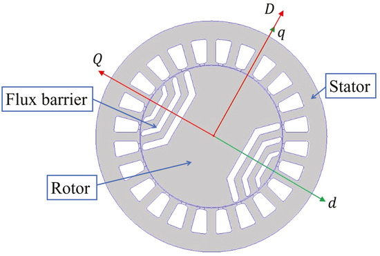Based on this, the roles of the synchronous inductances are interchanged; consequently, the direct axis aligns with the plunger’s magnetic path that exhibits the lowest reluctance for each pole, as illustrated in Figure 1. Hereafter, the rotational reference frame of the SynR machine is indicated by capital letters D–Q, to clearly differentiate it from that used for the PM machine.