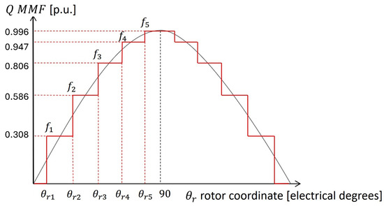 The MMF generators and are the average values of the sinusoid over the electrical angular span of each mover’s flux guide. The more layers, the more staircase steps; see Figure 5.