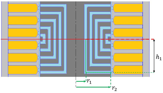 In order to solve the circuit model, first, the total area of the flux barrier was computed. For simplicity, the middle segment of the mover layer was considered, as shown with green lines in Figure 8. Considering the parameters shown in Figure 8, the area can be computed as the sum of two surfaces:
