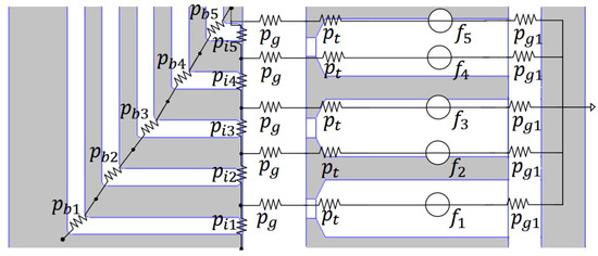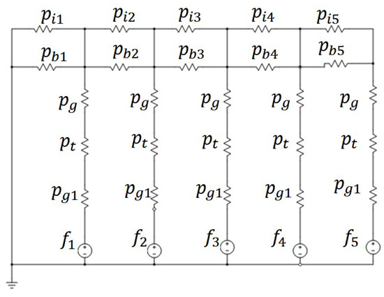 Since the magnetic circuit model for a pole pitch is symmetric, only half of the pole pitch are considered to simplify the lumped-parameter model, as shown in Figure 4. The MMF generators represent the Q-axis component of the stator MMF, while the net of permeances stands for the barriers () and air-gap flux tubes corresponding to the flux guides’ ends (). In this simplification, steel is considered as a magnetic short circuit, so there is no MMF drop. Since a regular mover pitch is considered, the air-gap flux tubes and their permeances () are all the same. All the components in the proposed Q-axis magnetic circuit model are normalized with respect to different bases: