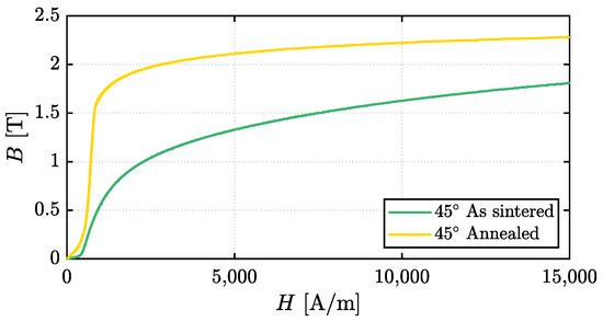 Comprehensive information on the measurements and the experimental setup can be found in [19]. The findings, shown in Figure 11, were incorporated into the 2D-FEA software (FEMM 4.2) to conduct simulations with the final material. The annealing process significantly enhanced the alloy’s magnetic capabilities, achieving saturation similar to that of conventional FeCo lamination stock. The sample in its initial state had a lower initial slope, indicating reduced initial permeability, whereas the heat-treated sample presented a steeper initial slope, reflecting a marked improvement in initial permeability. The BH curve of the annealed FeCo49V2 sample was employed for the simulations.