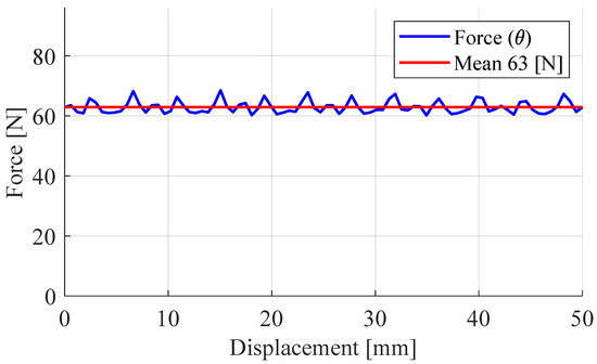 In [10], a comparison of the performance of the machine obtained when considering a traditional laminated material and an AM material is presented, showing a slight decrease in the thrust force with the proposed solution. Nevertheless, the solution with a traditionally laminated material was not feasible for this configuration, so this slight loss in performance was acceptable. As shown in Figure 12, a thrust force of 62.95 N was obtained from the load simulation. Figure 13 shows the mesh used for the analysis together with the visualization of the flux lines and flux density of the machine obtained in the 2D FEA post-processor. Due to the tubular configuration, the mover was brought to saturation more easily than in conventional rotating machines. Hence, saturation is a phenomenon which must be taken into account in the analytical design phase.