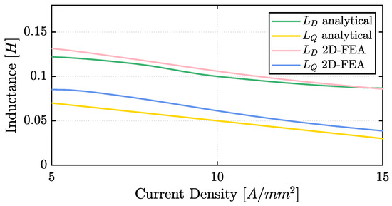 The value of the inductance value along the D axis decreased with the increase in current density. However, was first estimated with Equation (10), which considers only the potential drop in the air gap and neglects the one in the iron. This is correct only for low values of j because, when the mover saturates, the potential drop in the mover’s iron causes a reduction in and cannot be neglected. This phenomenon can be represented by adding the saturation coefficient , according to Equation (31). Figure 14 shows the trend in the inductances along the D and Q axes, comparing the estimation using 2D FEA simulations against the analytical model results. According to the comparison of analytical and 2D FEA results, neglecting the end effects did not significantly affect the analytical model.
