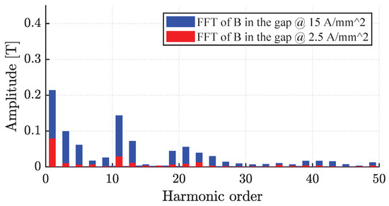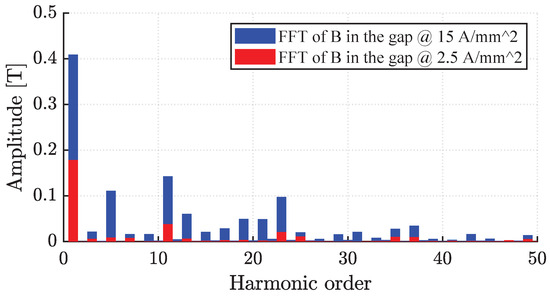 FFT of the flux density in the gap comparison at and 15 A/mm2 (D axis).