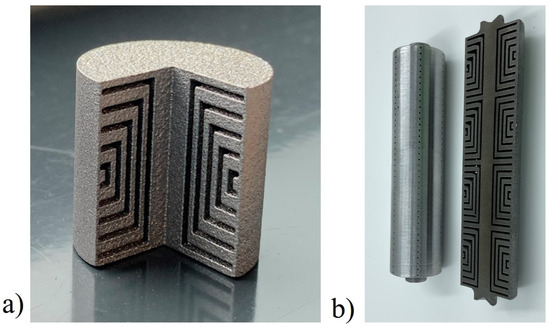To assess the feasibility of producing the proposed plunger design, a segment of the mover’s pole pitch was fabricated using a 3D printing technique with a mild steel powder. The printed model incorporated a 270° cutaway for direct examination and evaluation of the internal layout of the flux barriers. Despite the slim flux barrier thickness of 0.9 mm, the design was manufacturable via Selective Laser Melting (SLM), which yielded well-defined barriers. SLM is a metal additive process that uses a moving laser beam to melt metal powder layer by layer, creating solid cross sections of the part. This method is prevalently used in the fabrication of electrical machine components, as it produces parts with an enhanced density and microstructure in contrast to sintering. The distinct consolidation process results in improved mechanical properties compared to traditional methods for the same material [21]. As depicted in Figure 17a, an example of a 3D-printed mover pole is illustrated, wherein the rib thickness was increased from 0.1 mm to 0.5 mm. Figure 17b showcases the full mover prototype. Two identical prototypes were produced through 3D printing, with one cut along its longitudinal axis to scrutinize the printing quality. A machining allowance of 0.5 mm was factored in. However, challenges in printing the entire geometry can occur if the component is not angled at 45° during the additively manufactured process, due to perpendicular features to the build direction, necessitating additional support within the flux barriers for the full-length mover. These supports could be straightforward wall structures or more sophisticated designs, which can help minimizing eddy current losses. To facilitate the full geometry’s printing, a manufacturability-oriented redesign was imperative. Drain holes were incorporated at the flux barriers’ termini at 120° intervals—totaling six per circlet. For the 270 printed mock-up, they were not necessary, but they can be seen in the picture shown in Figure 17b). The rib thickness was adjusted from 0.2 mm to 0.7 mm to offer a 0.5 mm allowance for machining. This machining allowance is critical for meeting post-processing needs due to surface and cylindricity demands. The four-pole configuration, importantly, can still be sintered at a 45° angle without needing internal supports.