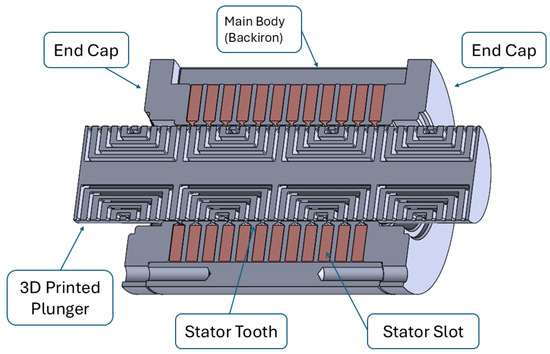 To minimize the force ripple and maximize the thrust force for the chosen configuration, a five-mover-layer machine was taken into account, in accordance with [18]. Since the plunger geometry was obtained by means of additive manufacturing, the material considered for the analysis was the alloy FeCo49V2, a metal powder studied specifically for AM applications.